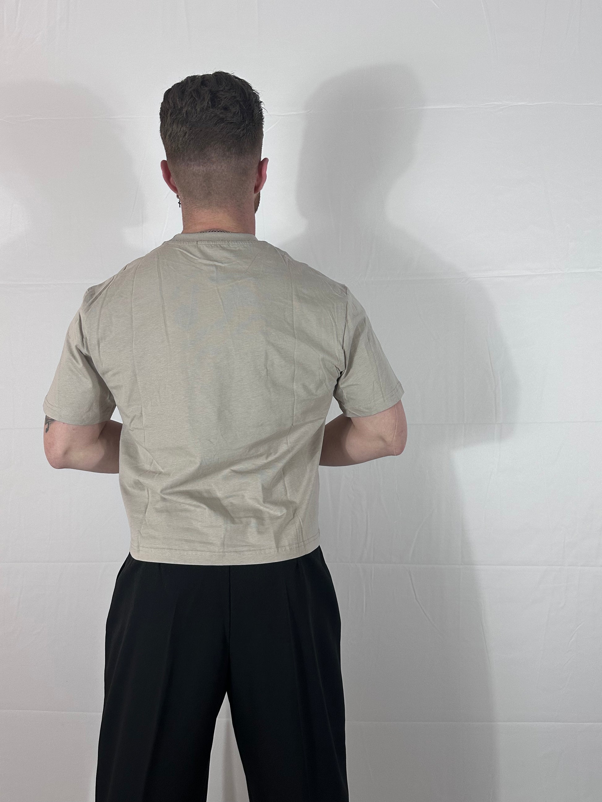 INFO VESTIBILITÀ DEL NOSTRO LUCA Il nostro LUCA è alto 1.80 m pesa 83 kg e indossa la taglia M. In questa versione, LUCA sceglie la vestibilità progettata originariamente per questo capo: la maglia cade esattamente sulla linea della vita, valorizzando la fisicità atletica e mantenendo un'estetica affilata, precisa e pulita. La taglia M permette di esaltare il taglio crop e la struttura delle spalle, offrendo quell'equilibrio perfetto tra volume e proporzione che definisce l'anima dell'Articolo 40.